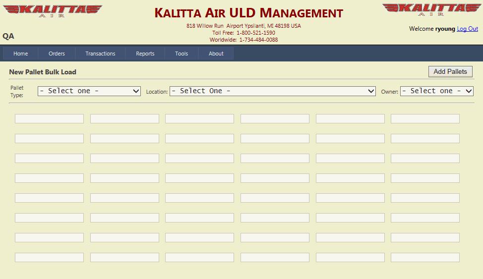 From any screen, go to the Transactions menu item and select Bulk Load New ULDs. The screen opens.